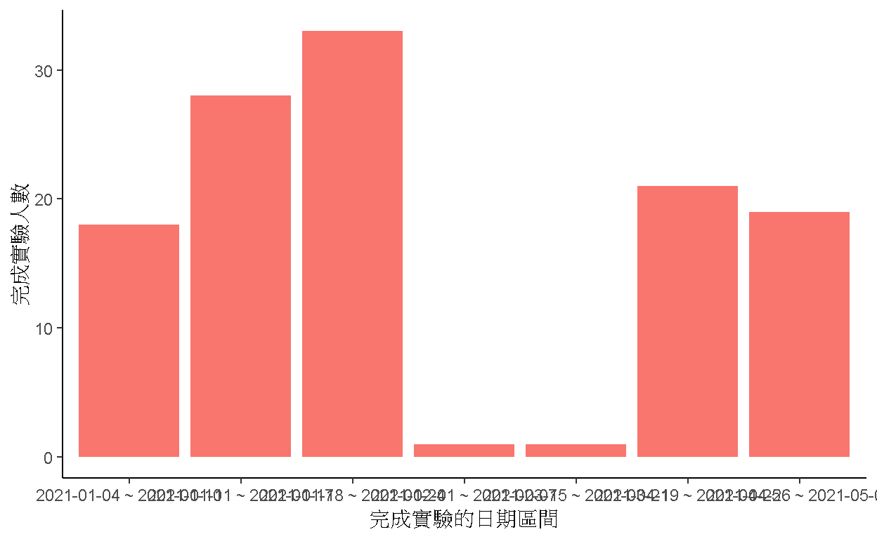。依照完成日期,統計各週參與實驗的人數如下圖。