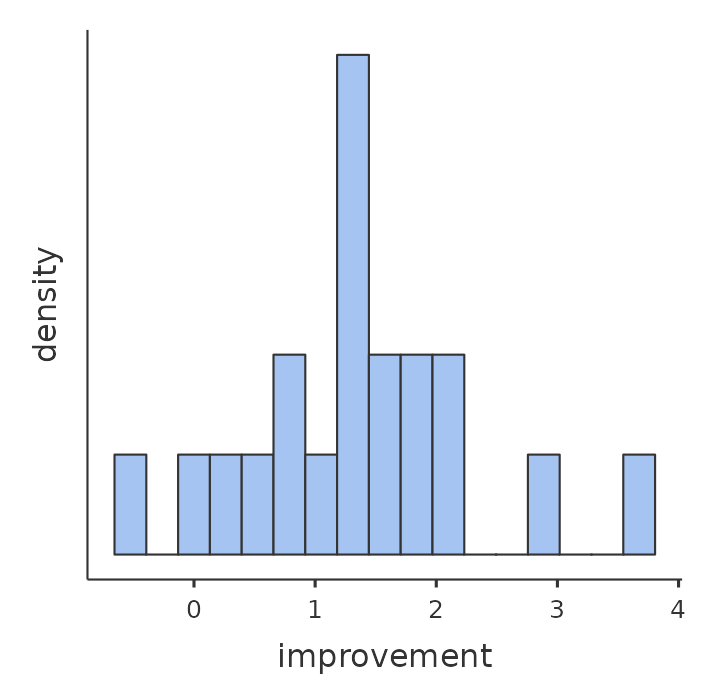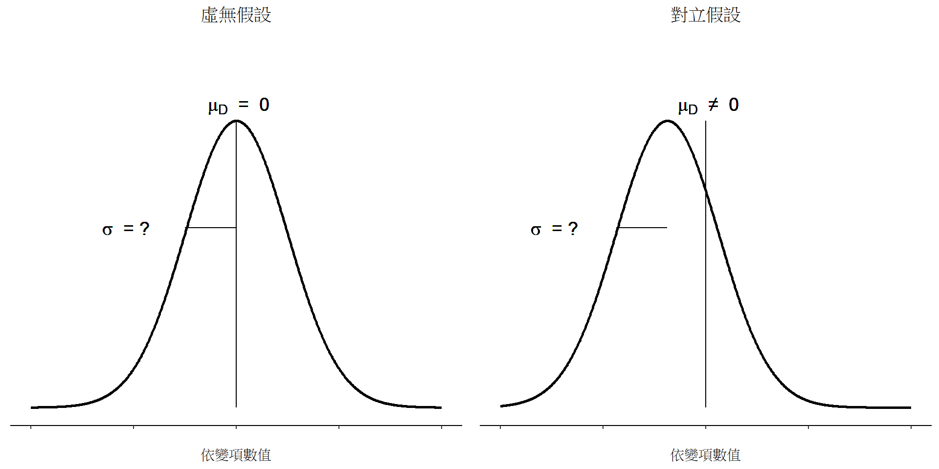 同一位參與者前後測試的差異分數(D),或參與重覆量數設計於不同條件測得的表現差異分數(D)所構成的樣本資料平均值\(\bar{D}\)及樣本標準差\(s = \sqrt\frac{\sum(D-\bar{D})^2 }{n-1}\)